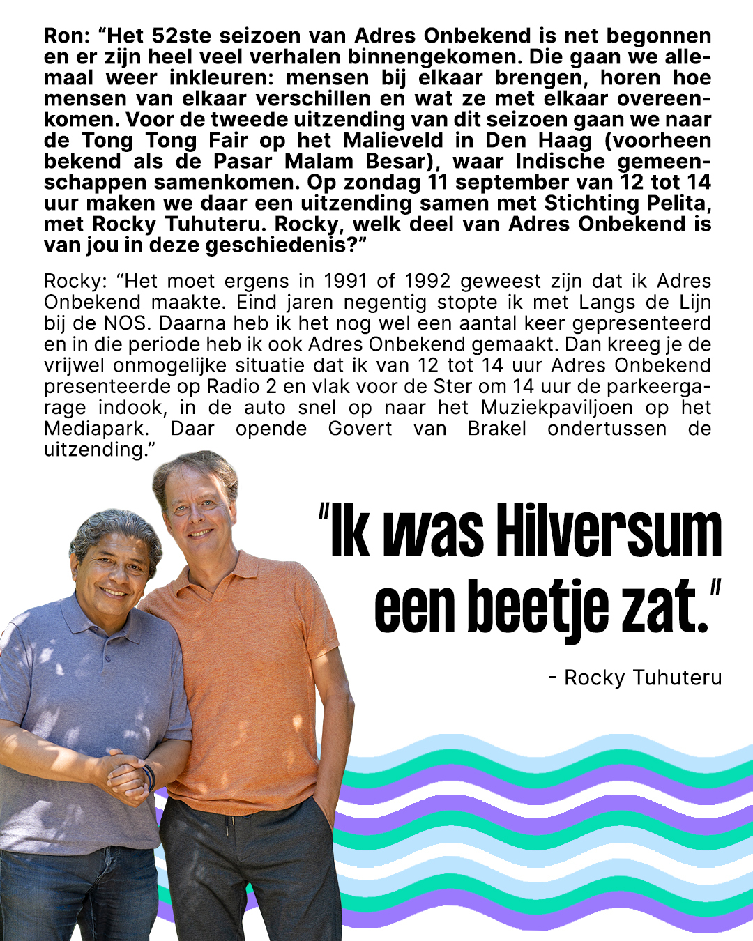 Zondag 11 september zendt Adres Onbekend live uit vanaf de Tong Tong Fair in Den Haag! Op uitnodiging van directeur Rocky Tuhuteru van Stichting Pelita maakt Adres Onbekend een speciale locatie-uitzending waarin verhalen met een Indische achtergrond centraal staan.