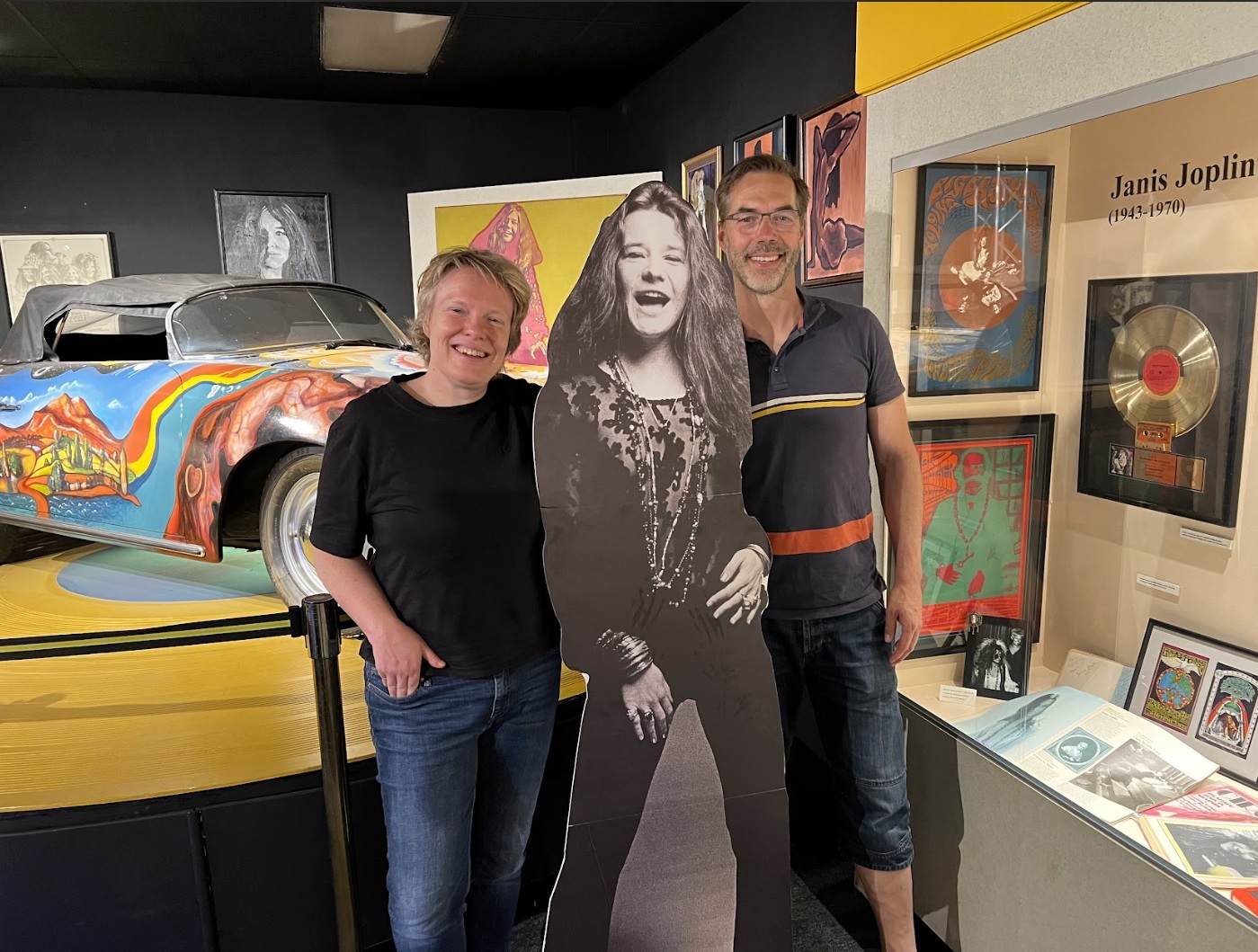 In het Museum Of The Gulf Coast bewonderen we een aantal van de persoonlijke bezittingen die de familie Joplin in bruikleen heeft gegeven: schilderijen die Janis maakte, de brieven die ze schreef, foto’s, krantenartikelen én…een replica van haar psychedelisch beschilderde Porsche. Museumgids Tom Neal neemt ons mee langs de vitrines en vertelt dat de Janis Joplin-collectie jaarlijks veel bezoekers trekt.