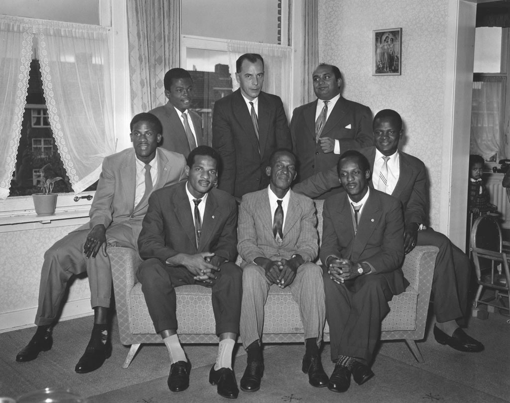 Surinaamse voetballers in Nederland, met o.a. Humphrey en Frank Mijnals, Michiel Kruin, Erwin Sparendam en Charley Marbach, Amsterdam, 18 oktober 1958.