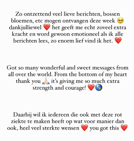 "Het geeft me zoveel extra kracht. Ik word gewoon emotioneel als ik alle berichten lees, zo enorm lief vind ik het", aldus Emma Heesters op social media.